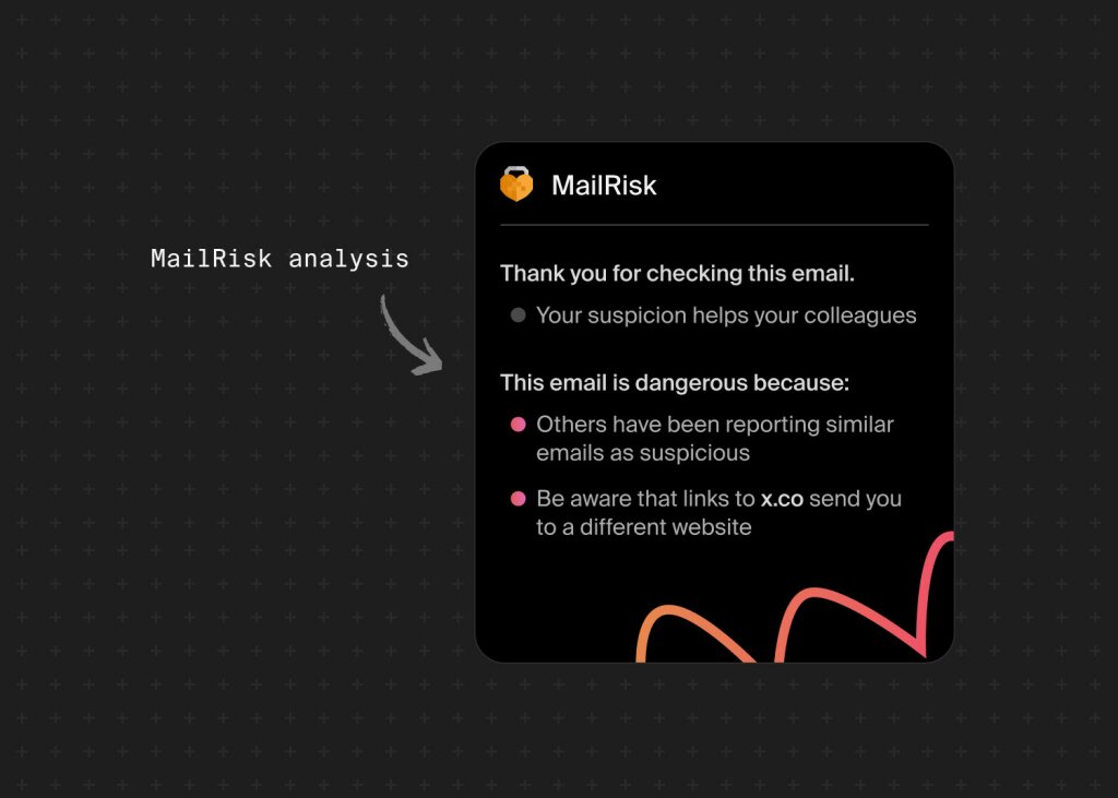 Make checking and reporting malicious or phishing emails easy. A one-click tool like MailRisk lets people flag suspicious emails safely while giving security teams useful insight.