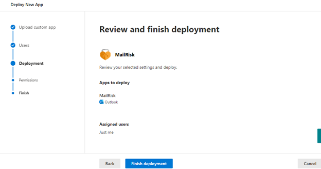 The above step requires you to upload an XML manifest file, which describes the MailRisk add-in to Exchange and Outlook, from your local hard drive.